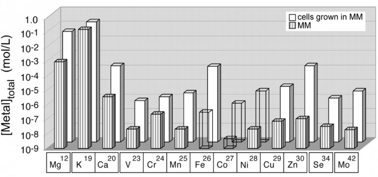Figure 1. The E. coli Metallome. The total metal content of E. coli grown in minimal media (grey) as compared with the total metal content of media alone (white) determined by inductively coupled mass spectrometry (ICP-MS) (Outten et al., 2001).