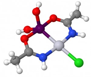 Figure 1. X-ray crystal structure of Arsenoplatin-1. The model is color coded as follows: arsenic (purple), platinum (lt. gray), oxygen (red), nitrogen (blue), chlorine (green), carbon (dark gray) and hydrogen (white). (From Swindell et al., 2013).